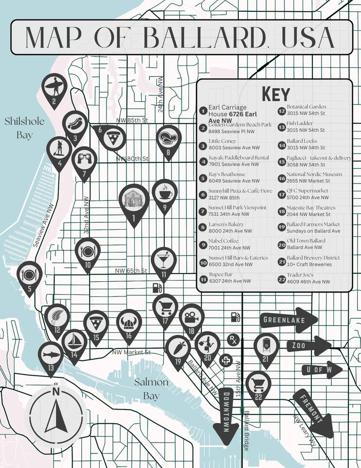 The Earl Carriage House is located on a beautiful tree-lined street in a quiet, residential pocket of the exciting Ballard neighborhood. A handful of coffee shops and restaurants are just a few blocks away, or take a 15-minute stroll to historic downtown Ballard. You will be close to public transportation, the sandy beaches at Golden Gardens and so much more. Late March and Early April visitors will be treated to a magnificent display of Cherry blossoms! Located in the northwestern part of the city, Ballard is known for its maritime heritage, Scandinavian roots, and thriving food and arts scene. Start your day with a stroll to the Ballard Farmers Market, open every Sunday from 10am to 3pm, where you'll find fresh produce, flowers, artisanal crafts, and food trucks serving up local delicacies. Explore the trendy boutiques, coffee shops, and galleries along Ballard Avenue, or head down to the historic Hiram M. Chittenden Locks, where you can watch boats pass between the Puget Sound and Lake Union. Foodies will love Ballard's diverse dining options, from classic fish and chips at the iconic Ballard Smokehouse to gourmet farm-to-table fare at Stoneburner or Staple and Fancy. Sample local beers at the many microbreweries and pubs, including Stoup Brewing, Reuben's Brews, and Lucky Envelope Brewing. Ballard is also home to several parks and green spaces, including Golden Gardens Park, which offers stunning views of the Olympic Mountains and Puget Sound, and the Ballard Commons Park, which hosts community events and concerts throughout the year. With its mix of urban charm, natural beauty, and cultural offerings, Ballard is the perfect base for exploring Seattle. And with your cozy accommodations at ECH, you'll have everything you need to relax and recharge after a day of adventures.